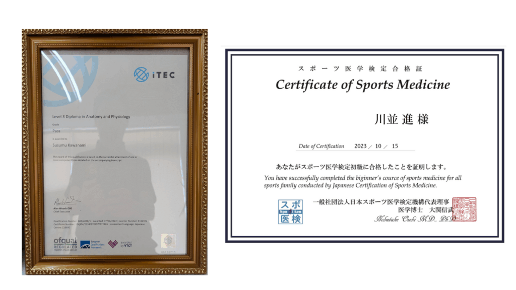 1 解剖学に基づく評価姿勢・可動域を確認し、原因を追究します。 | 2 国際資格 × スポーツ医学国際ライセンス(英国iTEC)に基づく手技で、安全かつ効率的に変化を引き出します。 | 3 再発防止にはセルフケアが不可欠ですセルフストレッチ/生活動作の改善まで設計し、「再発しない体」へ導きます。 |